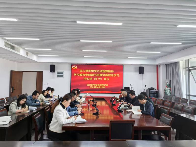 428日上午,学院党委举行深入贯彻中央八项规定精神学习教育专题读书班学习会。院及智能信息技术研究中心班子成员、全体支部书记、系(室)负责人及科级以上党员干部参加学习会。院党委书记周平主持会议。