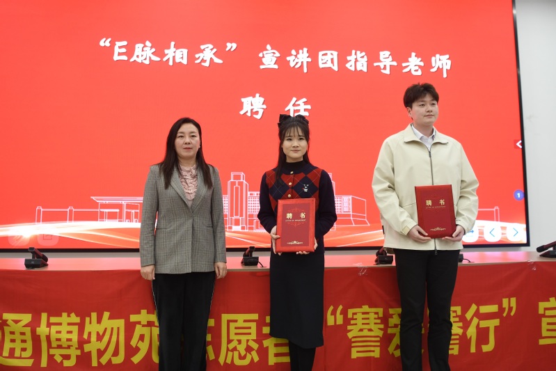 活动现场,举行了做爱视频 “E脉相承”校史宣讲团指导老师聘任仪式,校党委宣传部副部长刘艳为指导老师颁发聘书。